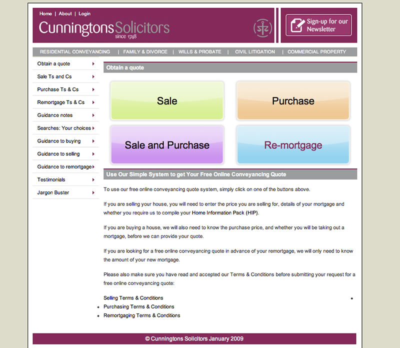 I developed an online conveyancing quotation application for Cunningtons Solicitors which allows a user to obtain a quotation, input their payment card details and instruct the solicitors to act for them online. Cunningtons themselves can log in to the application and edit the prices and parameters so that they can react to the conveyancing market quickly without needing to contact me.